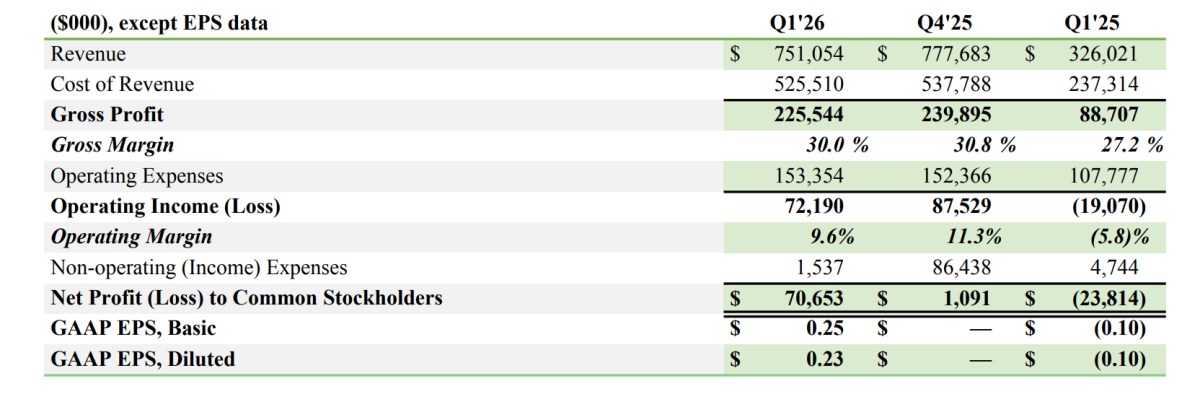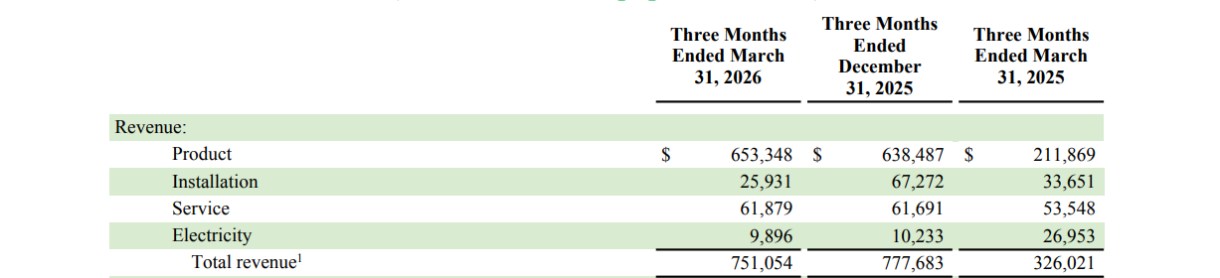 受惠資料中心與現地供電(on-site power)需求升溫,Bloom Energy 公布 2026 年第一季營收達 7.51 億美元,年增 130%,其中產品營收大增 208%。獲利同步改善,毛利率升至 30%,營業利益達 7,219 萬美元,較去年同期轉虧為盈,每股盈餘(EPS)達 0.25 美元。