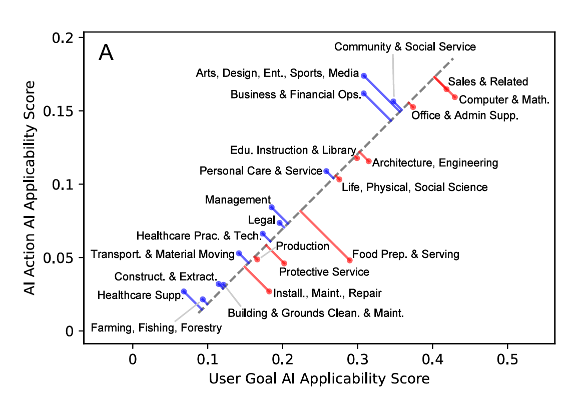 ▲ 底部X軸為使用者目標AI適用性分數,左端Y軸為AI行動的AI適用性分數;藍色線為高適用性職業,紅色線為低適用性職業。