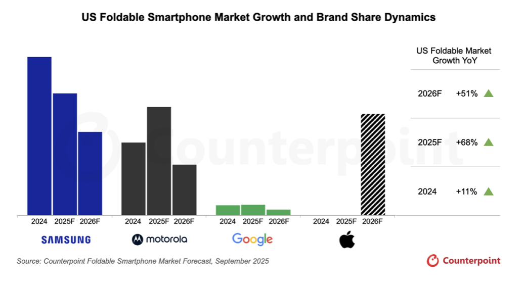 同時,Motorola 在翻蓋式機種的迅速擴張,以及 Google 以 AI 為核心的創新策略,正重塑市場競爭格局。隨著蘋果預計於 2026 年正式加入戰局,摺疊機將不僅成為高階智慧型手機的主流選擇,也將帶動市場進入新一波成長期。
