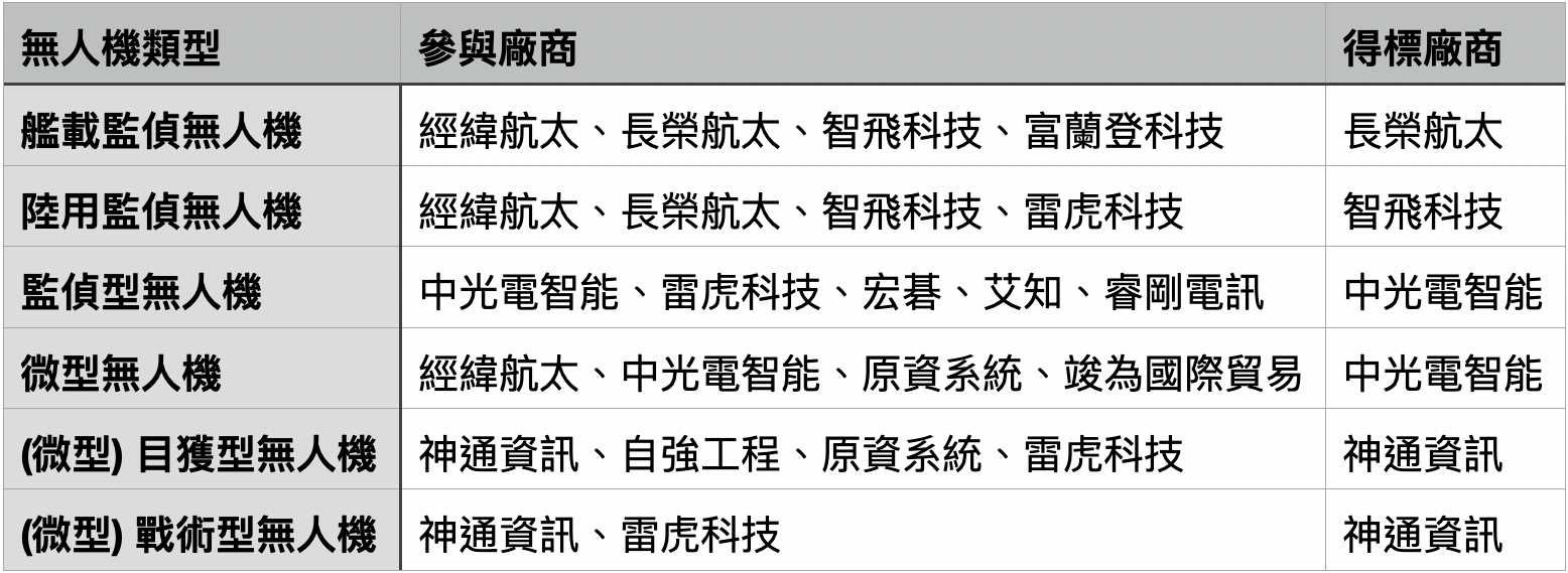 2024 年 8 月首輪軍用商規無人機決標結果,機種項目共分為微型、微型目獲型、微型戰術型、監偵型、陸用監偵型、艦載監偵型六種,最終由四家廠商勝出。
