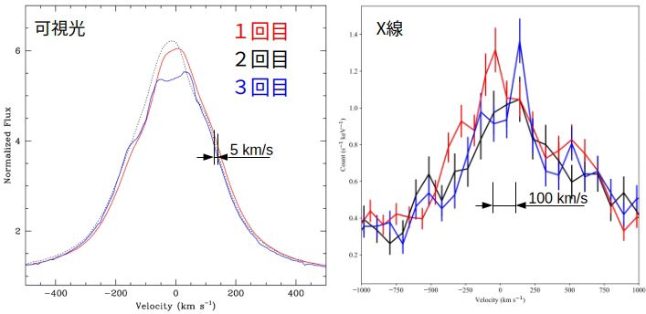 ▲ 左圖是團隊取得雙星的Hα發射線,右圖則是X光波段下的鐵發射線。兩者同時各取三次分光資料比較。(Source:JAXA)
