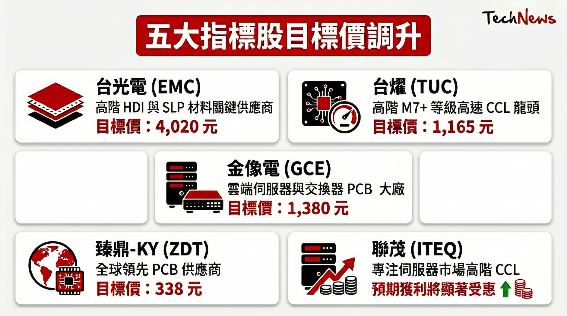 - 金像電(GCE): 雲端伺服器與交換器 PCB 大廠,目標價調升至 1,380 元。