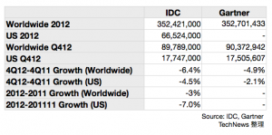 IDC、Gartnet 最近陸續發出了對 2012 年第四季全球個人電腦銷售量的預測出貨數字,兩家公司的預測數字雖有點落差,但卻同聲表示,2012 年季第四季的個人電腦出貨量與去年同期相比是持續下滑。不過對於全球個人電腦品牌的排名兩家調研機的次序就完全相同了,只是成長衰退數字略有落差。